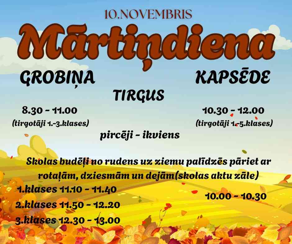 Mārtiņdiena ieved mūs pārejā no darba laika uz atpūtas laiku. Visi rudens darbi pabeigti, klēts pilna, galds klāts, un cilvēki var baudīt gada bagātību. Senlatvieši ticēja, ka Mārtiņdienā jāsmejas un jādzied, lai nākamais gads būtu auglīgs un jautrs. Tāpēc tradicionāli mūsu skolā notiek Mārtiņdienas aktivitātes - tirgošanās, pirkšana, rotaļas, dejas, dziesmas utt.
